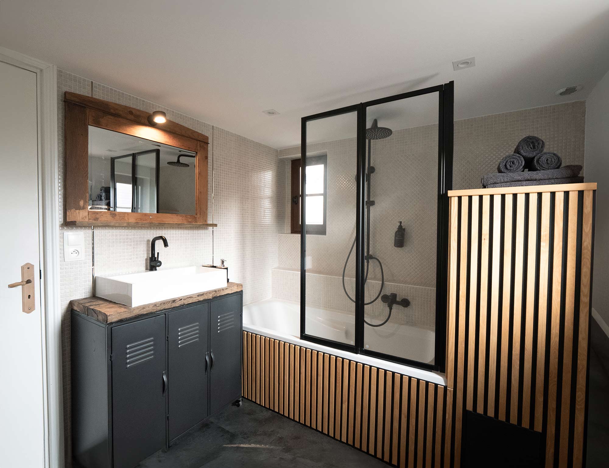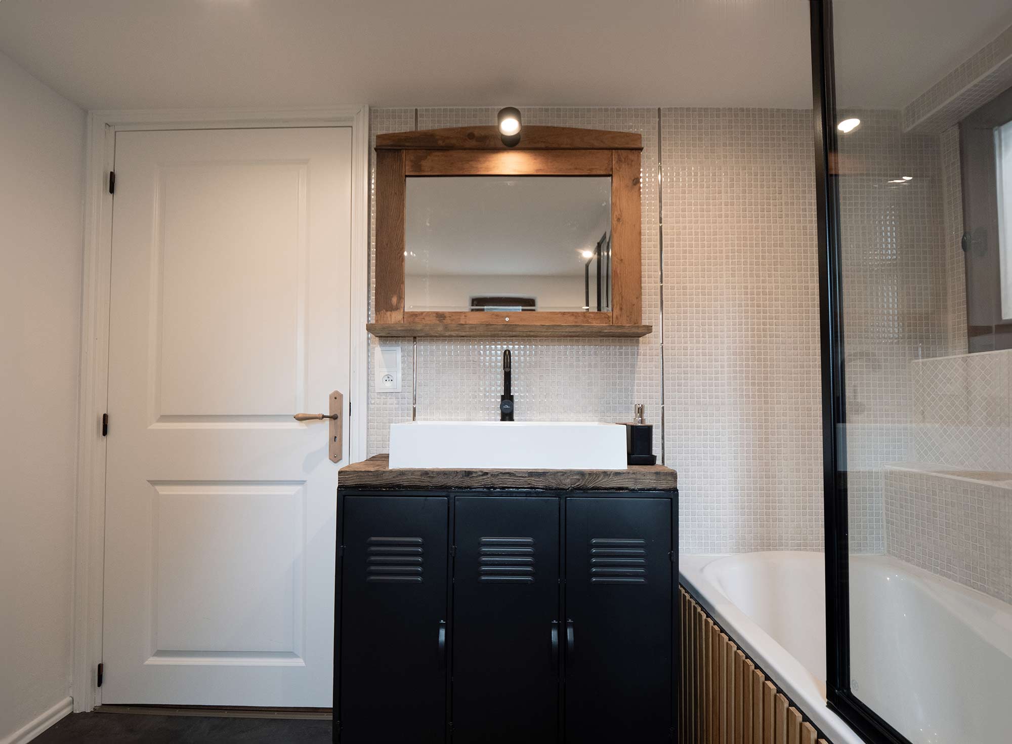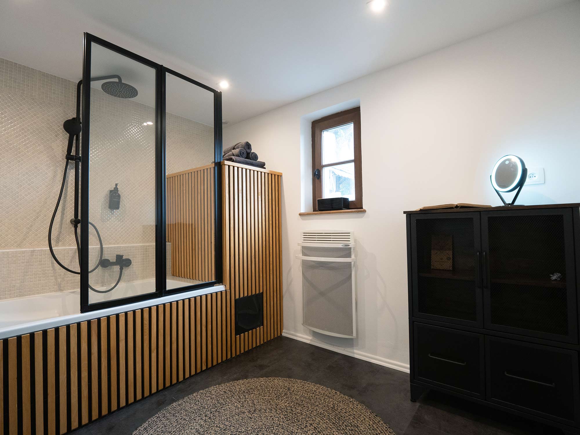 Das Badezimmer im zweiten Obergeschoss ist mit einer Duschwanne (Stehhöhe unter der Dusche ca. 1,80 m, zusätzliche Handbrause vorhanden) und einer faltbaren Duschwand ausgestattet. Im Badezimmer finden Sie ausreichend Stauraum für Ihre Bad- und Kosmetikartikel. Ein Haartrockner ist ebenso vorhanden, wie eine Grundausstattung an Kosmetikartikeln.