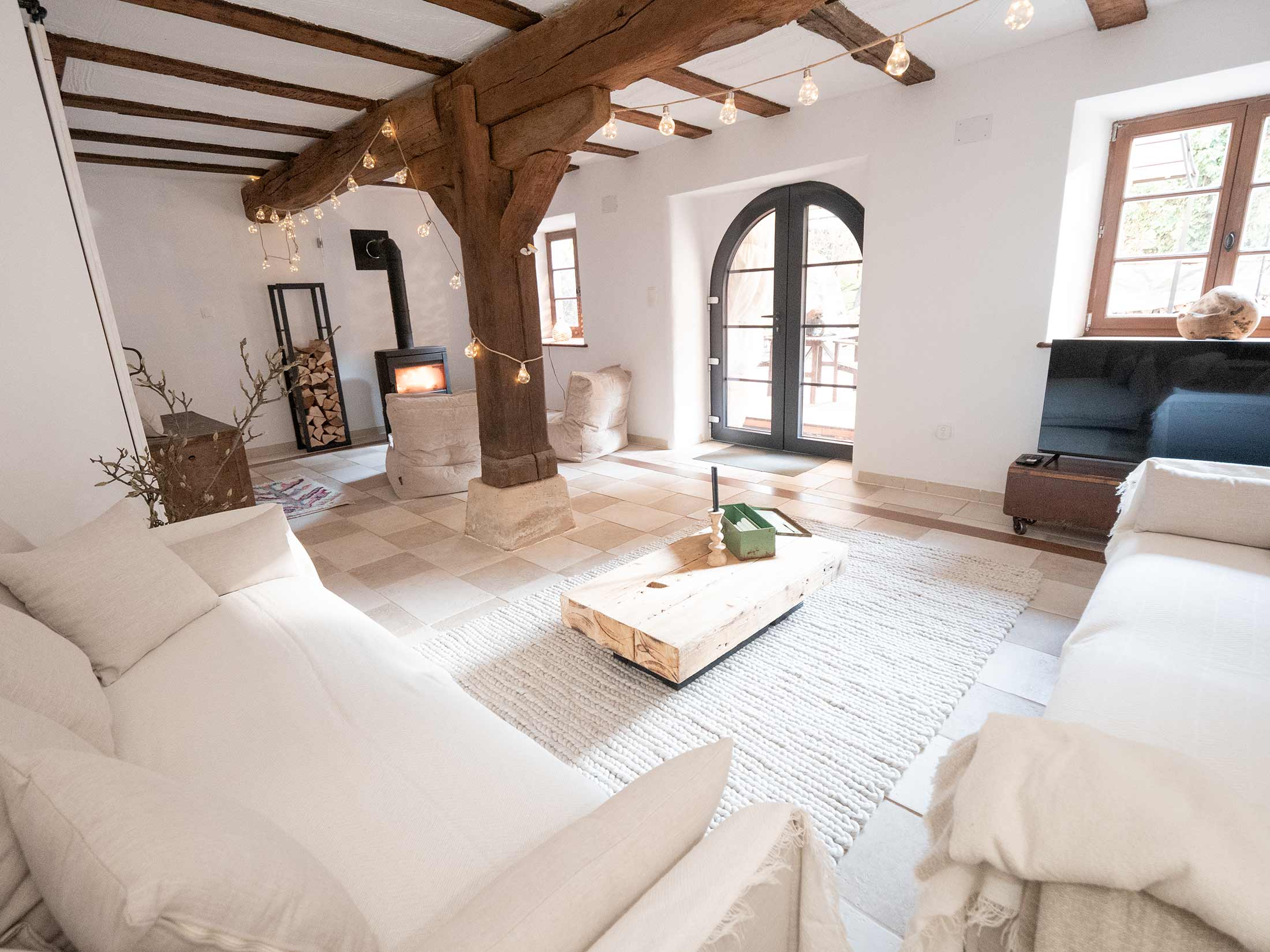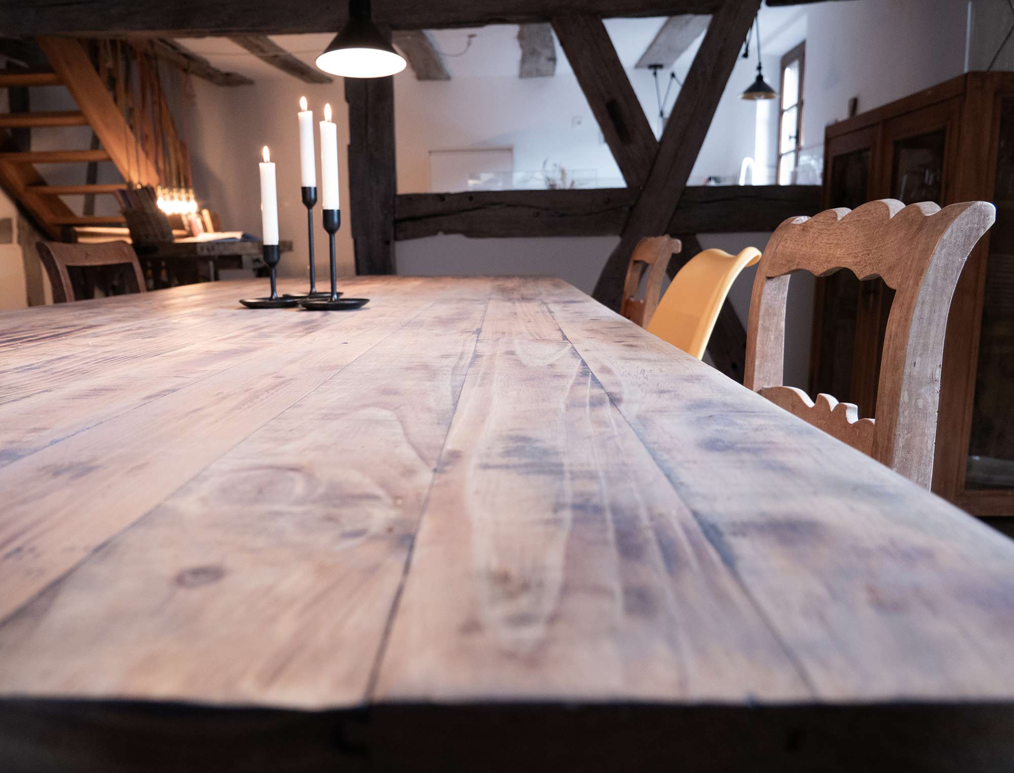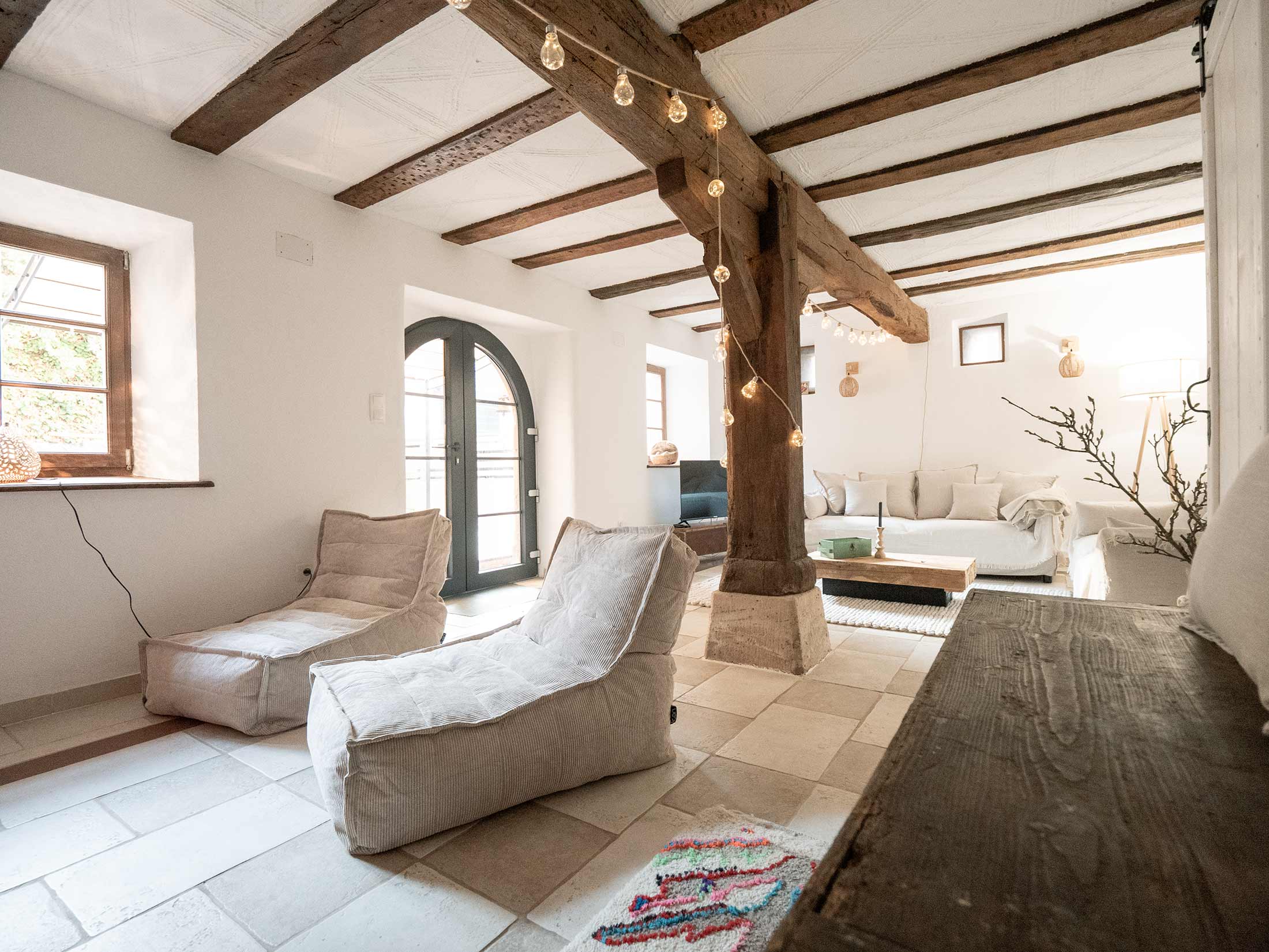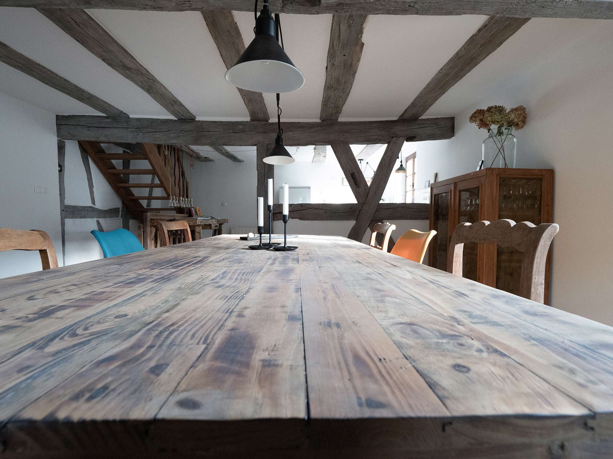 Der Essbereich ist mit einem 2,80 m langen Tisch ausgestattet, an dem acht Personen komfortabel Platz finden. Für ein Wein-Tasting steht ein mit ausgewählten Weinen bestücktes Weinregal zur Verfügung (Infos zum Wein-Tasting finden Sie hier). Ergänzt wird der Essbereich durch gemütliche Sitzkissen, die zum Entspannen und Verweilen einladen.
