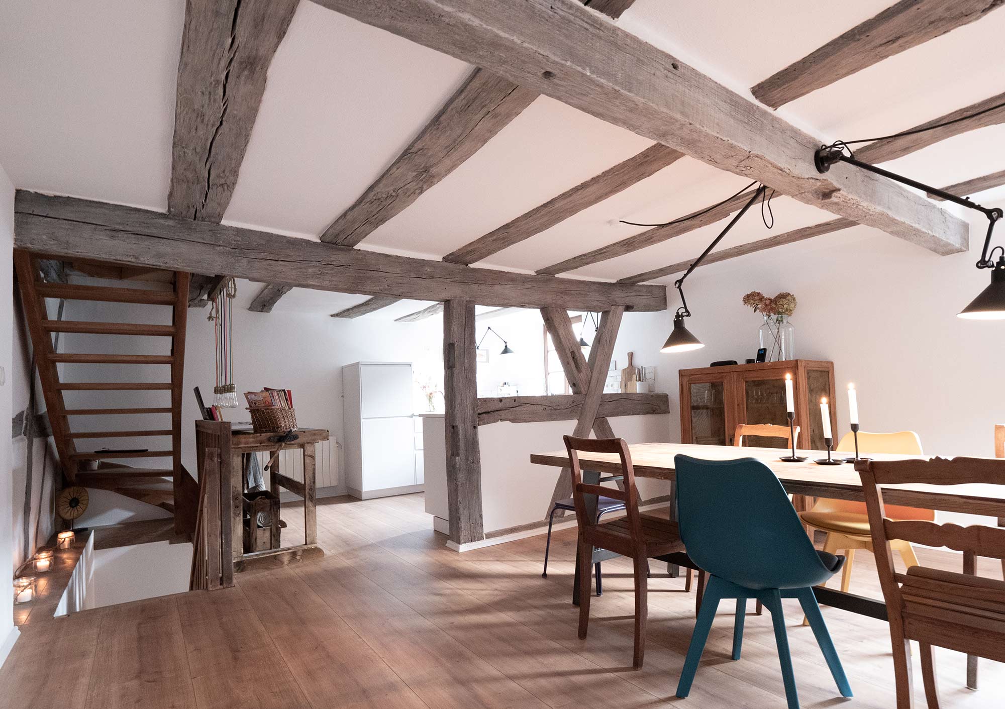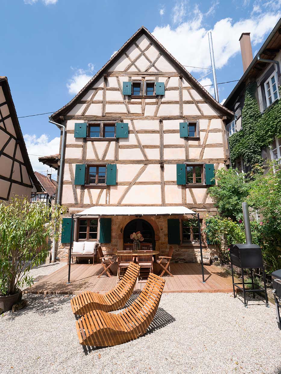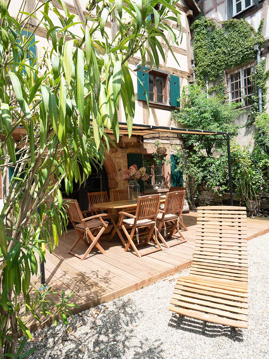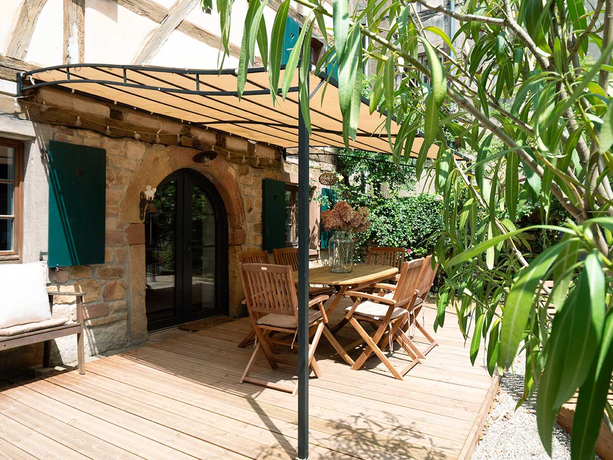 Der ca. 100qm große Innenhof mit kleinem Garten und geräumiger Holzterrasse steht Ihnen zur Alleinnutzung zur Verfügung. Für die Zubereitung traditioneller Flammkuchen oder Barbecue, steht ein Flammkuchenofen bereit. Sofern Ihr Auto weniger als 2 m breit ist, können Sie dieses ebenfalls im Innenhof abstellen. Ausreichend öffentliche Stellflächen finden Sie allerdings auch in unmittelbarer Nähe.