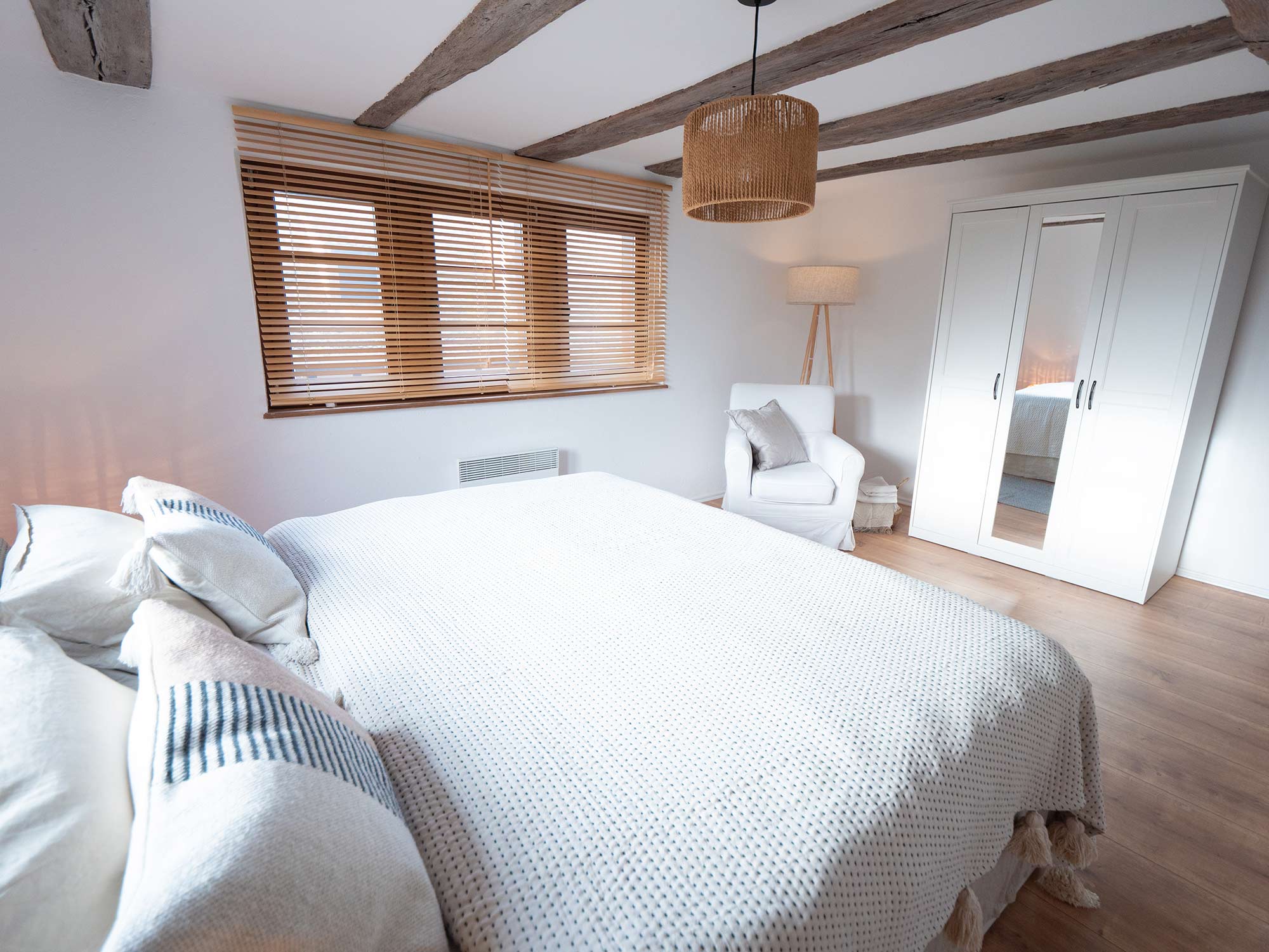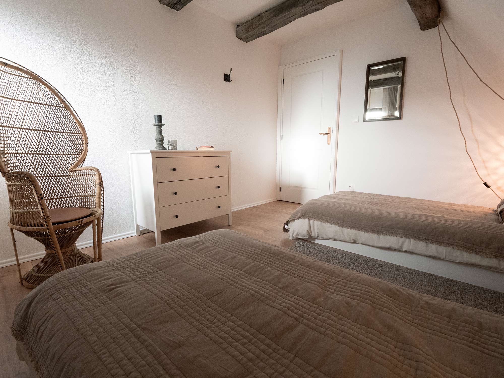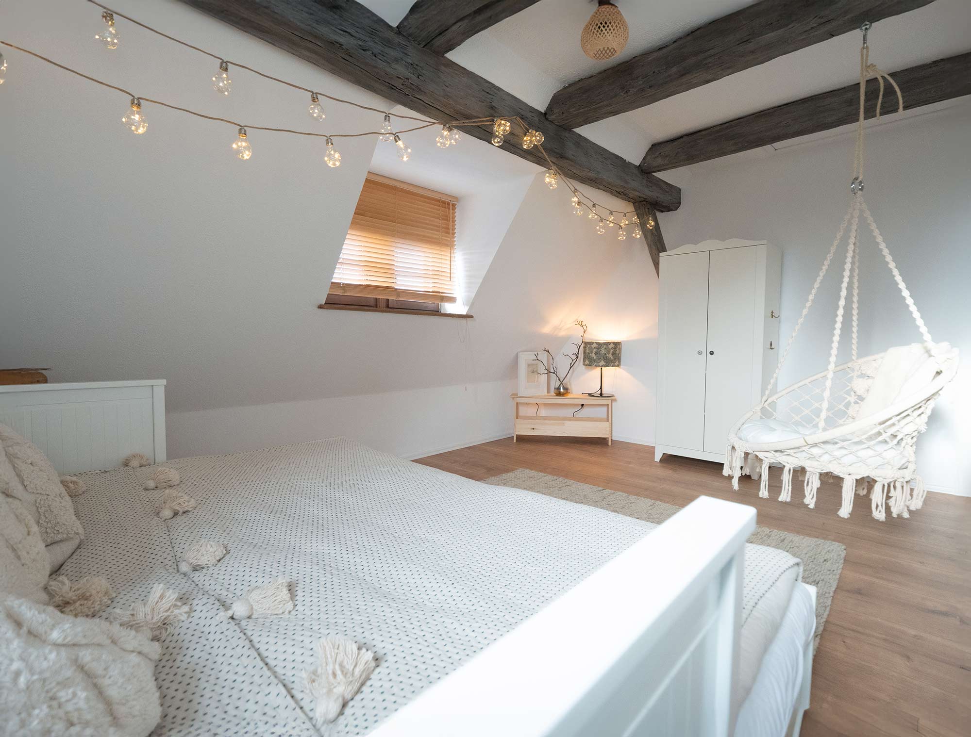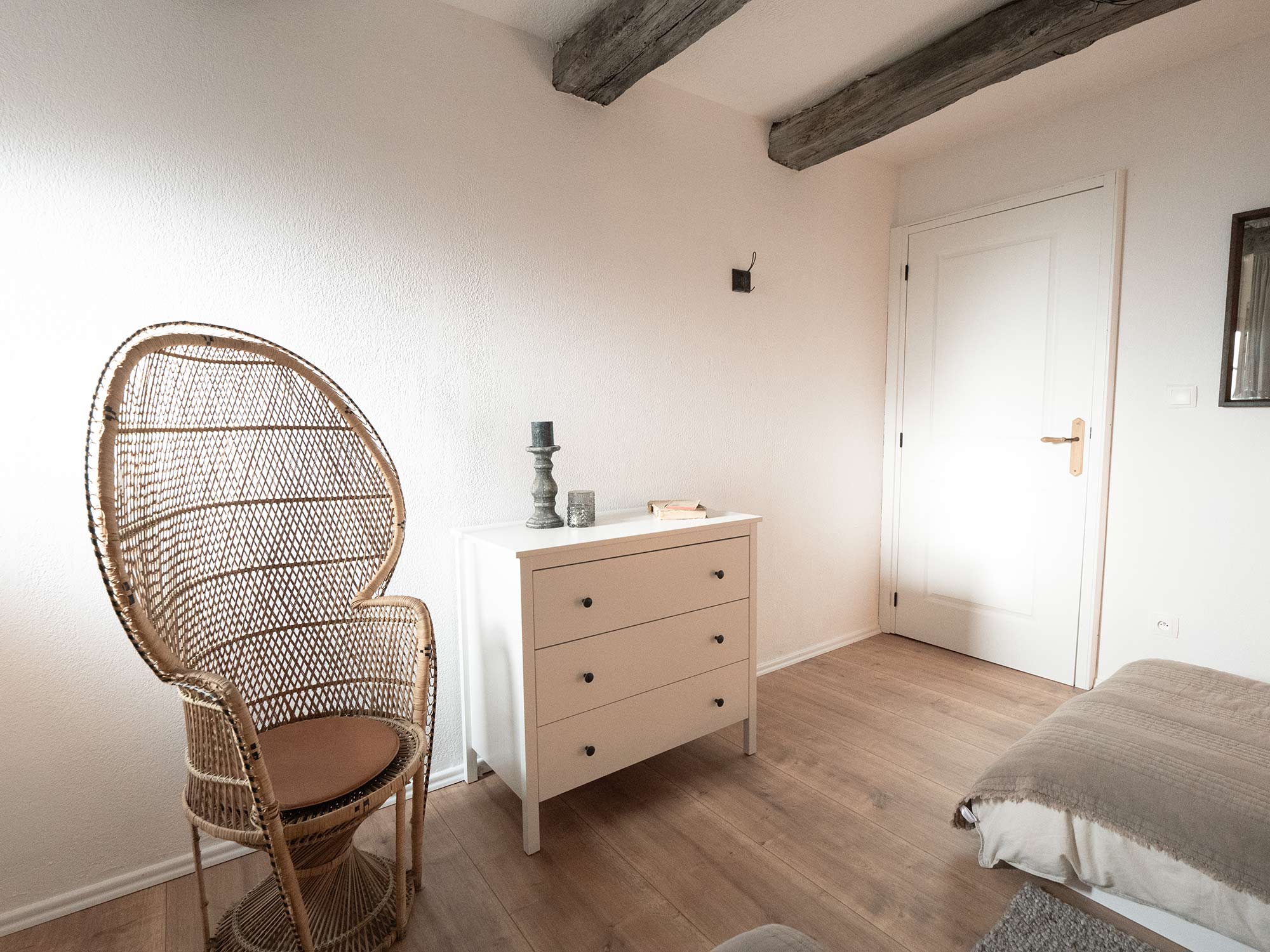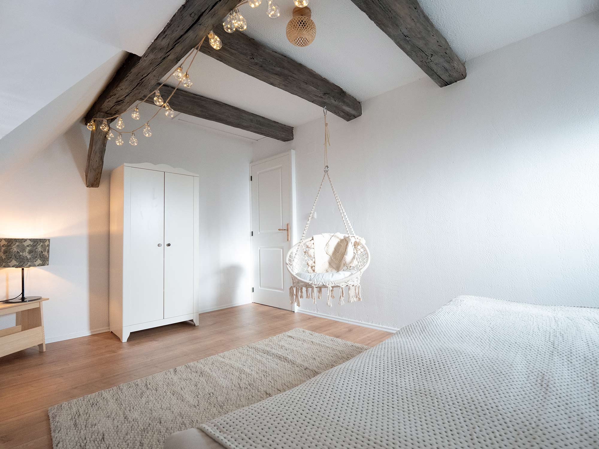 Das geräumige Schlafzimmer im zweiten Obergeschoss verfügt über ein 180 x 200 cm großes Doppelbett. Zudem befindet sich ein bequemer Sessel, ein Kleiderschrank sowie ein Schreibtisch mit Drehstuhl in diesem Schlafzimmer. Für das Aufstellen eines Beistellbettes für Kleinkinder bietet das Schlafzimmer ausreichend Platz.