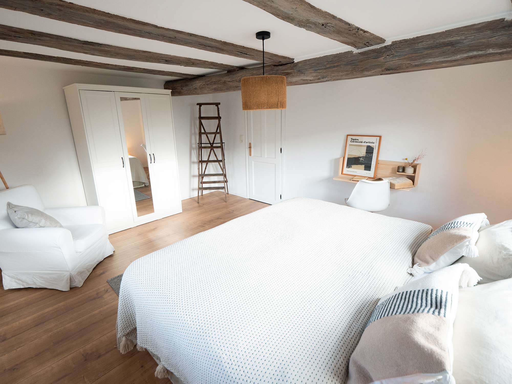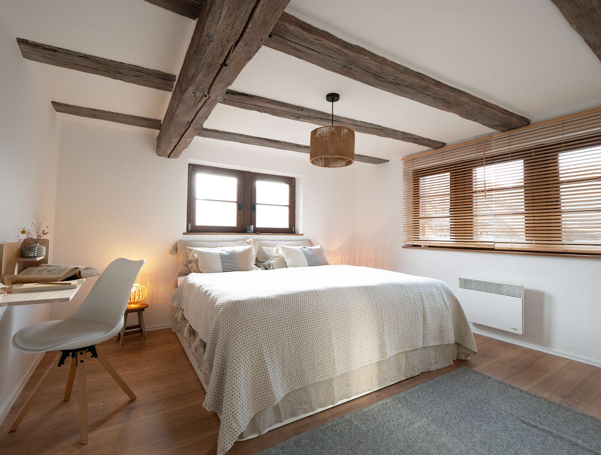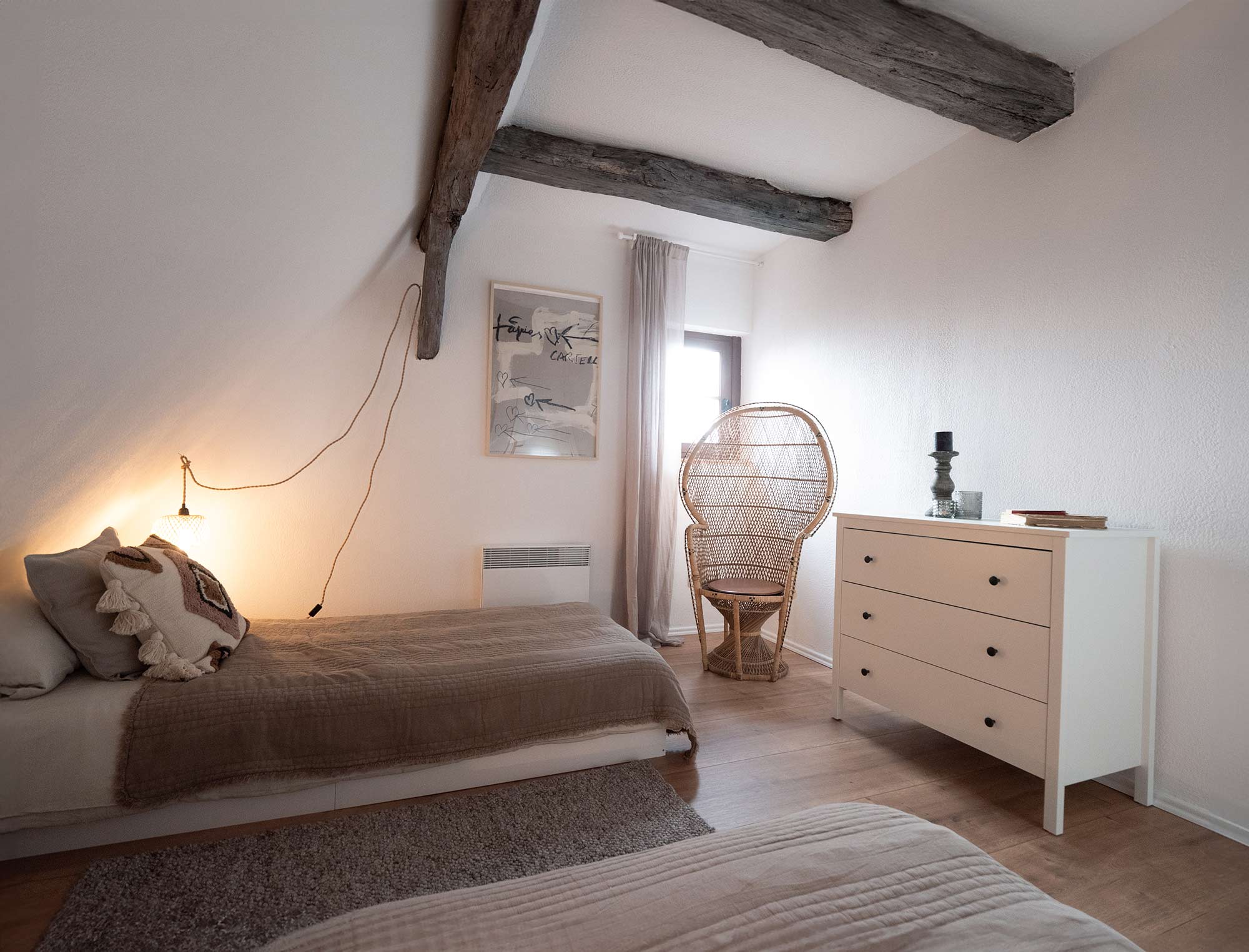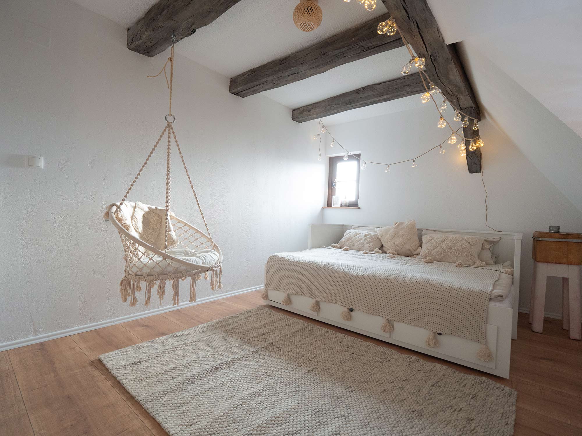 Das geräumige Schlafzimmer im zweiten Obergeschoss verfügt über ein 180 x 200 cm großes Doppelbett. Zudem befindet sich ein bequemer Sessel, ein Kleiderschrank sowie ein Schreibtisch mit Drehstuhl in diesem Schlafzimmer. Für das Aufstellen eines Beistellbettes für Kleinkinder bietet das Schlafzimmer ausreichend Platz.