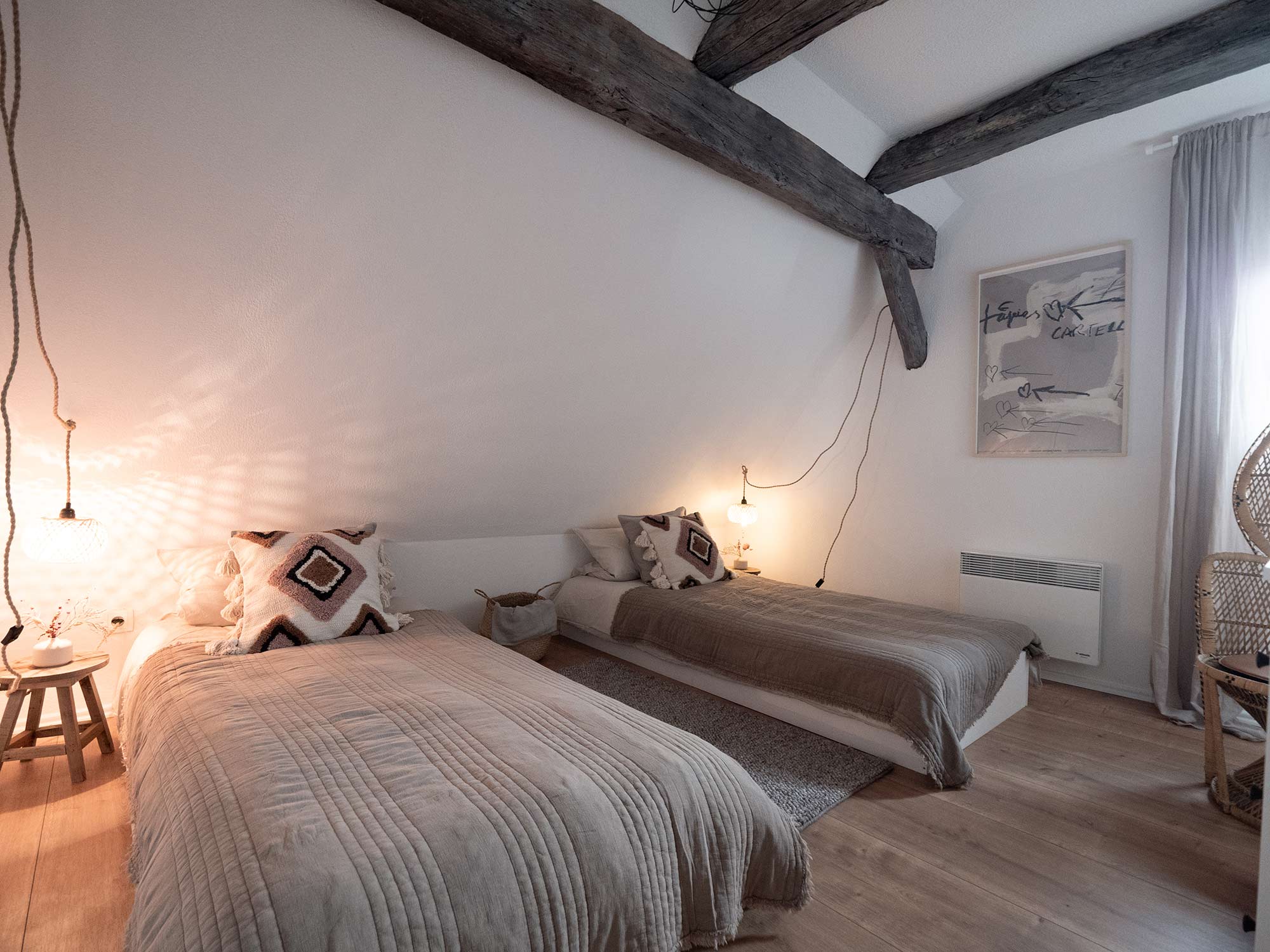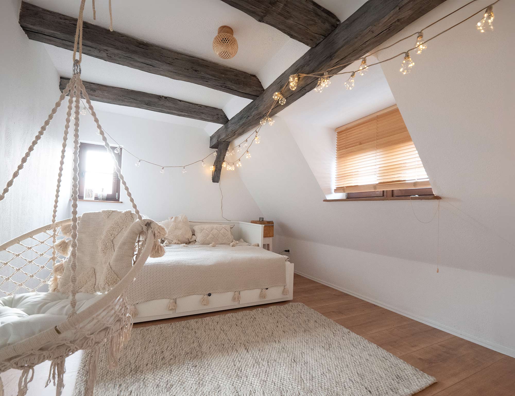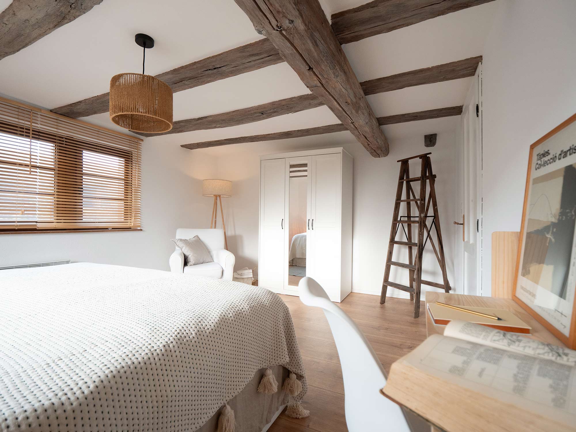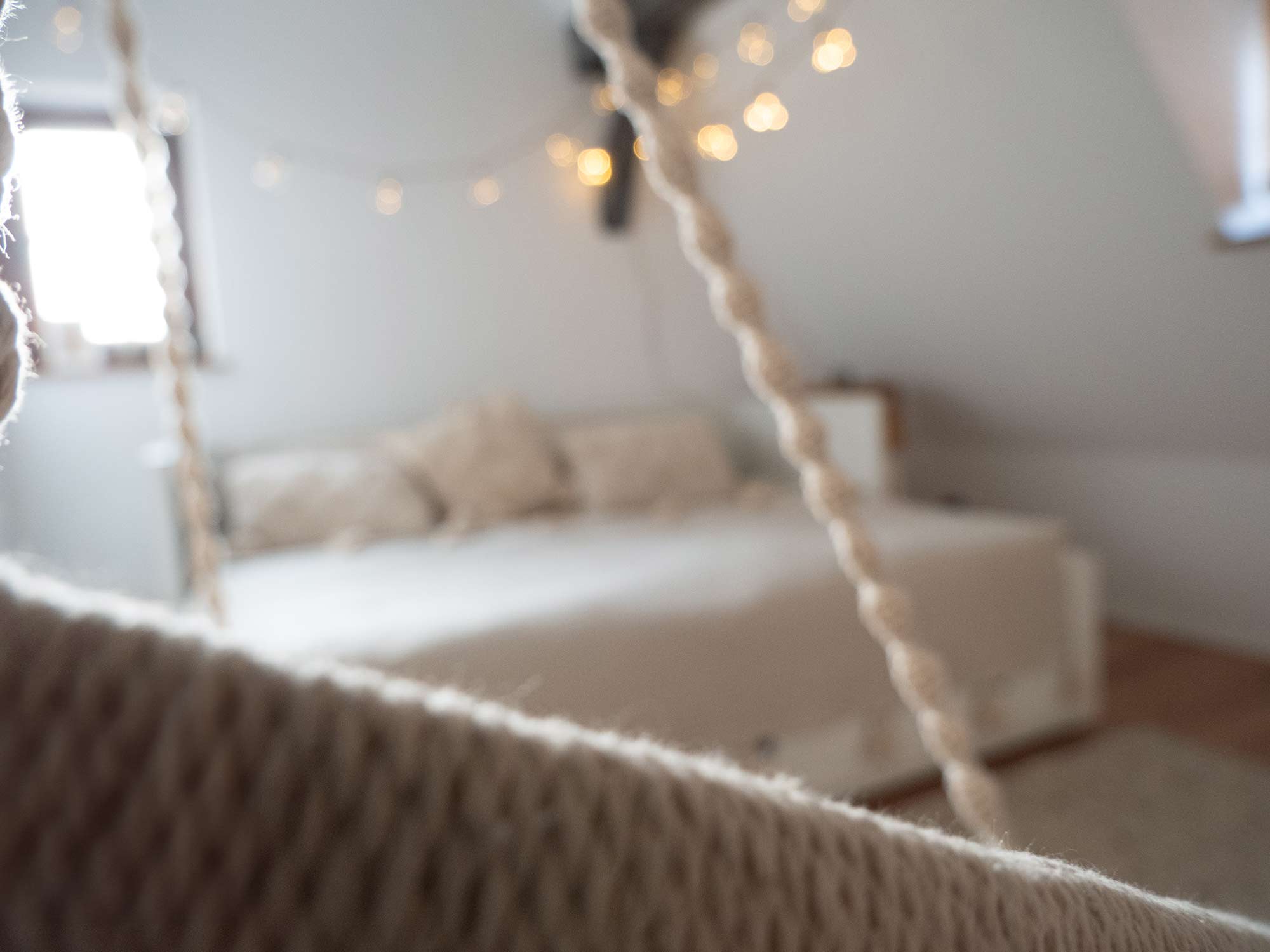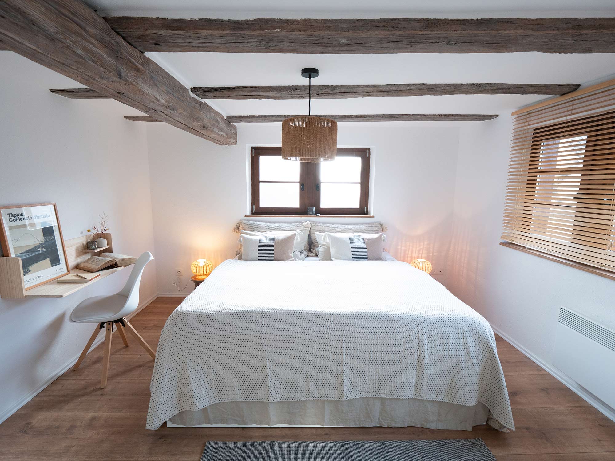 Das geräumige Schlafzimmer im zweiten Obergeschoss verfügt über ein 180 x 200 cm großes Doppelbett. Zudem befindet sich ein bequemer Sessel, ein Kleiderschrank sowie ein Schreibtisch mit Drehstuhl in diesem Schlafzimmer. Für das Aufstellen eines Beistellbettes für Kleinkinder bietet das Schlafzimmer ausreichend Platz.